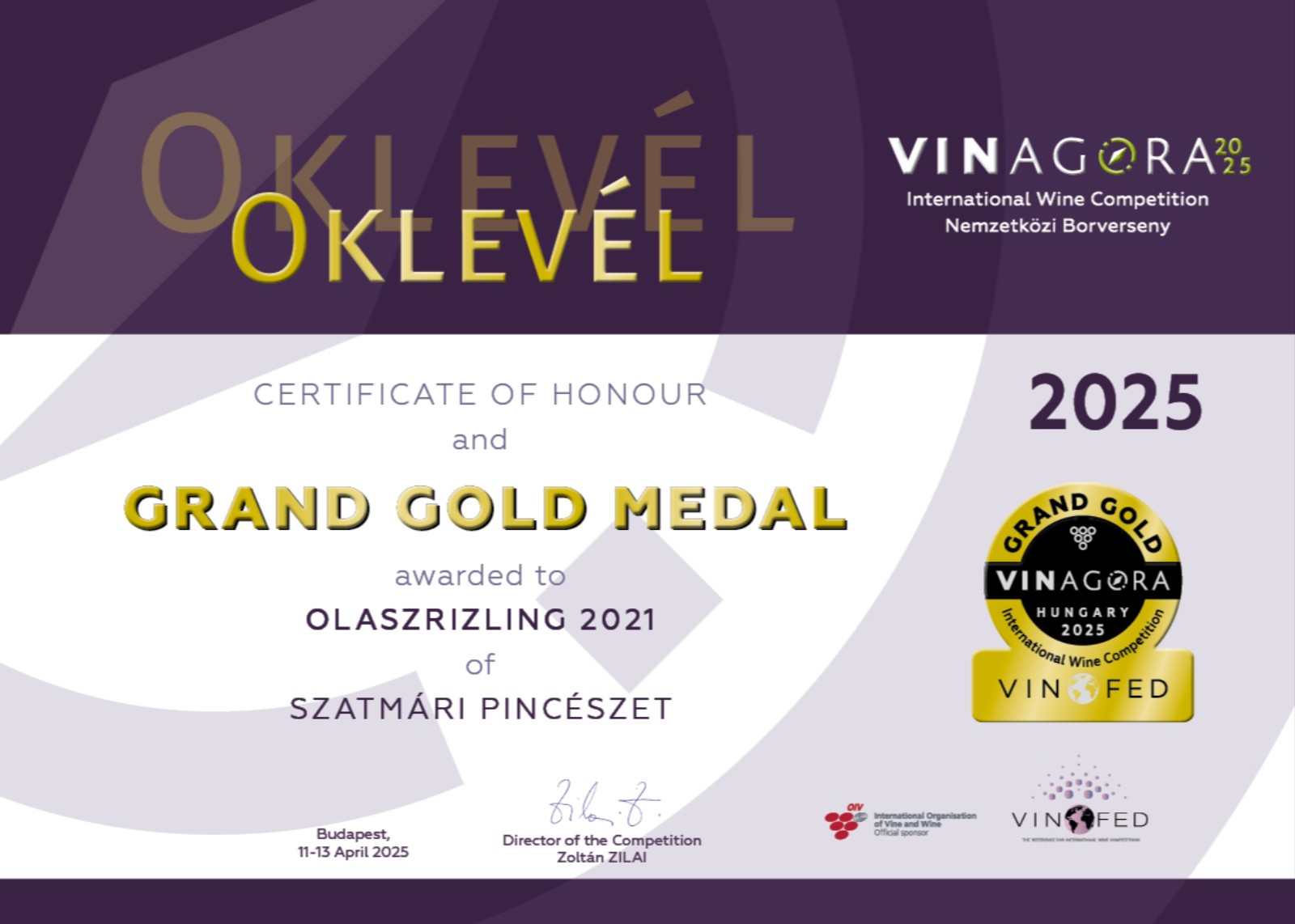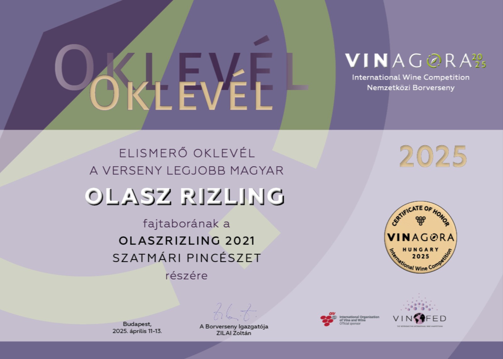 Élénk és komplex illatú bor, vérbeli olaszrizling. Illatában egyszerre jelenik meg a vulkanikus talaj üzenete, valamint a fajta szépségei, a virágos és gyümölcsös jegyek. Az illat másik különlegessége a folyamatos mozgás, fejlődés: újabb és újabb érdekességek lépnek elő, ha kellő időt és figyelmet szentelünk a bornak és hagyjuk levegőzni a pohárban. Jó savú, harmonikus, teljesen száraz és nagyon tiszta bor. A korty mélysége és zamatai mellett a frissességet érzékelve jó gondolatnak fogjuk tartani, hogy ez a bor nem kapott hordós érlelést: az alapanyag gyümölcsössége és a termőtalaj ásványossága szinte érintetlenül került a palackba. Hosszú és tartalmas utóízében megmutatkozik a fajtára jellemző mandulás jegy.